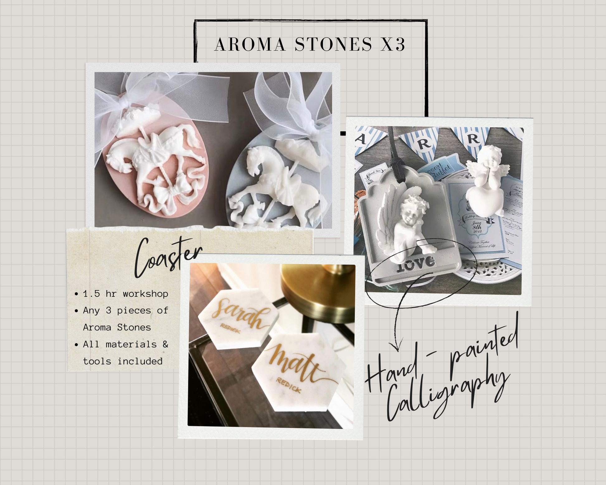送禮版:適合大小朋友、情侶、閨密一同參加,親手制作小禮物在慶祝活動送給致愛親友:例如Baby Shower 、周年紀念日或生日等。1 套3件不同款色的擴香石,可加上手繪祝福語、名字或日期 ,典雅的手繪字體更顯別樹一格的心思,1 套3件擴香石附上古典禮盒。