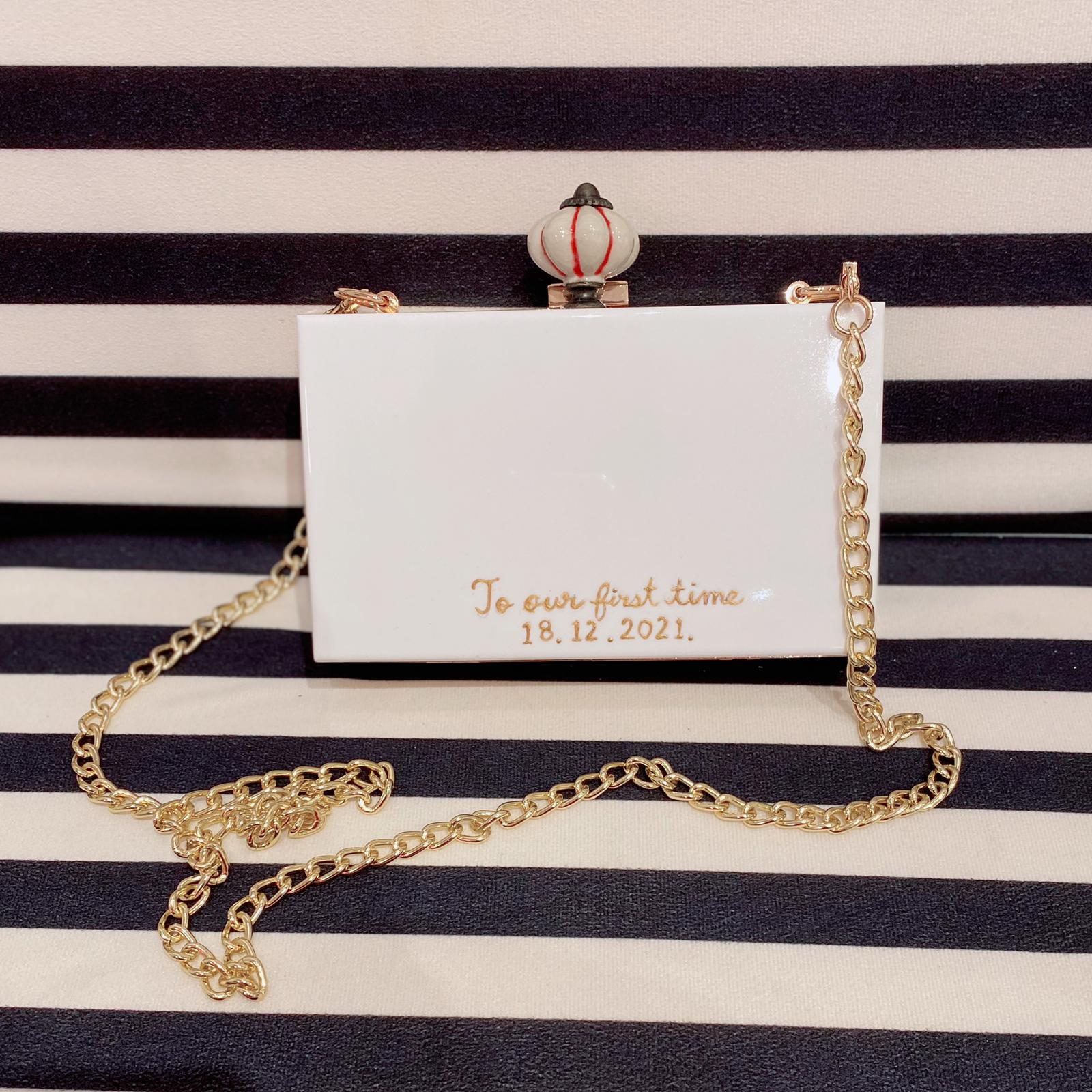 If you like to add additional statement, birthday messages or a special date at the back of the clutch bag, please order from this link.