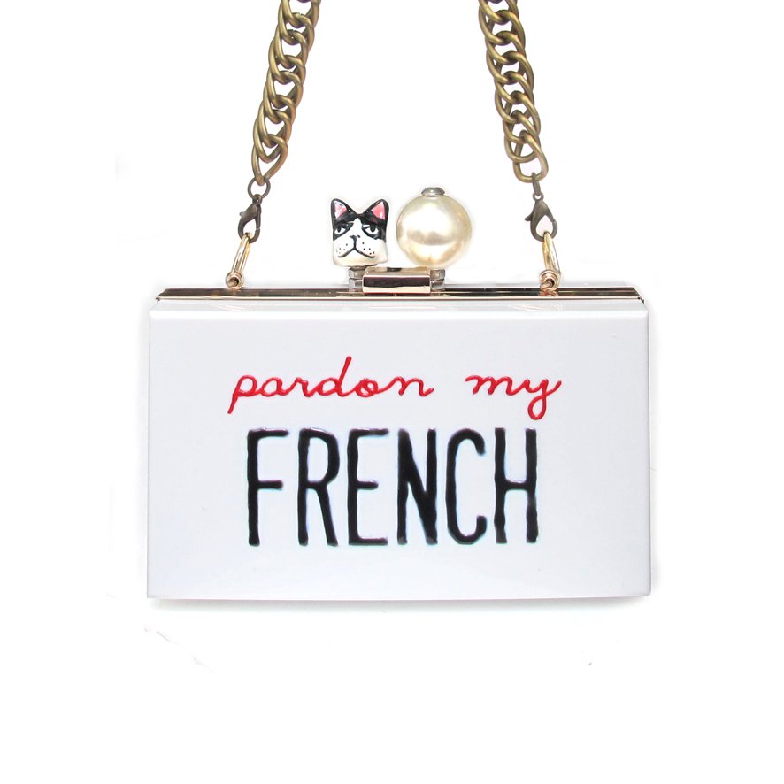 Porcelain bulldog and faux pearl charms with clear Swarovski crystal.