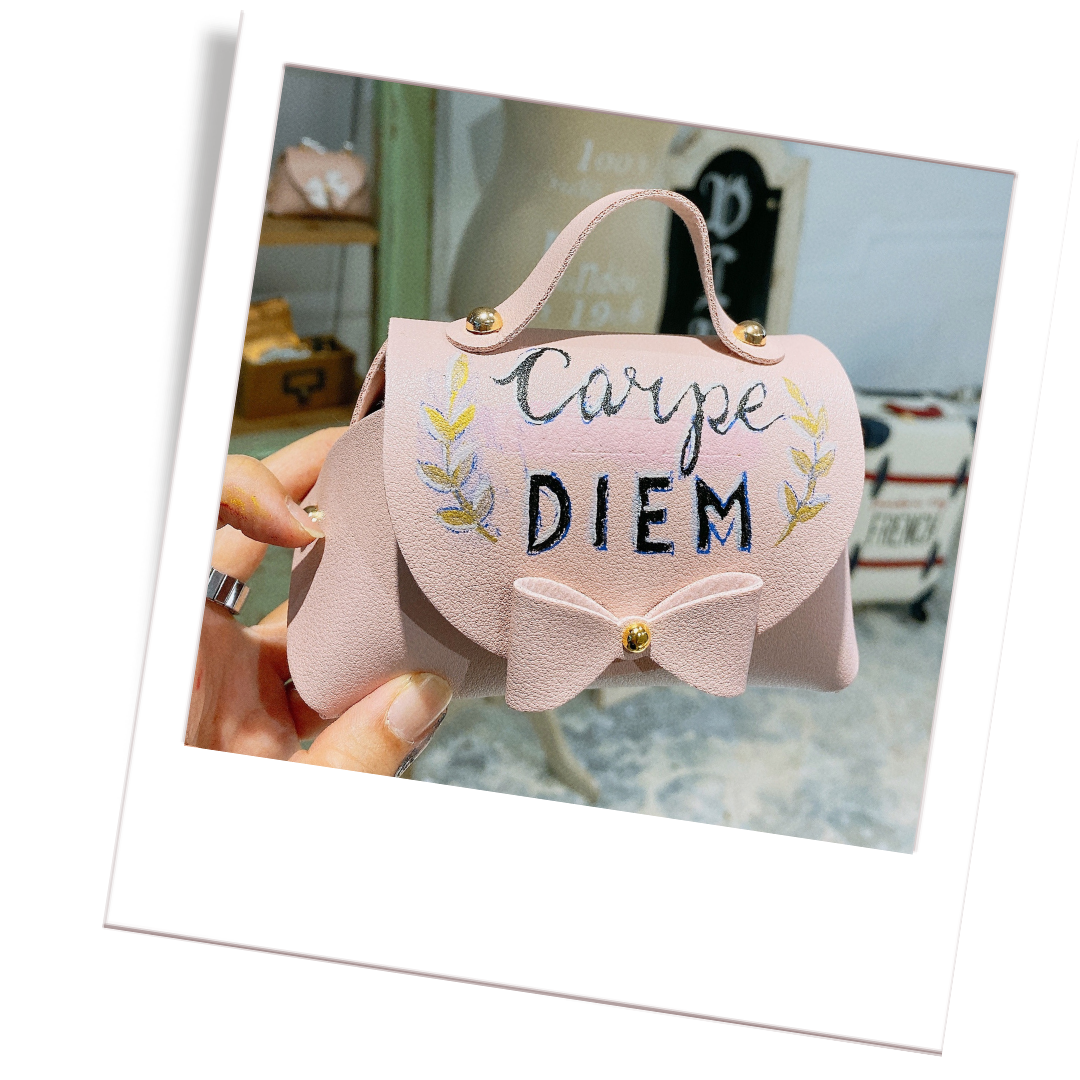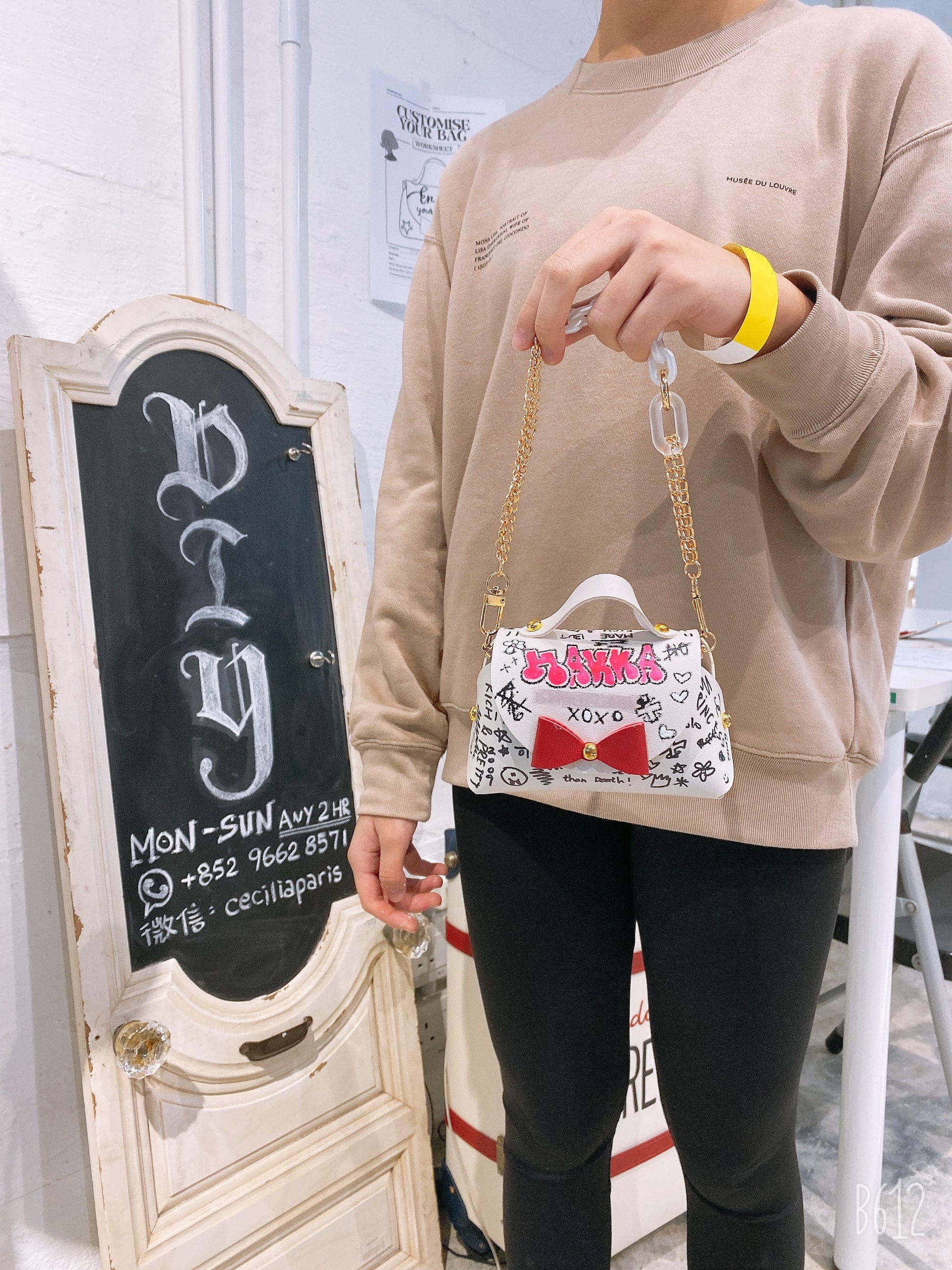 「童趣迷你手袋工作坊」設計師敎你製作獨一無二的迷你手袋,把你的名字或statement 短句,以塗鴉的風格繪畫在迷你手袋上,趕上街頭潮流之餘亦不輕易「撞款」。
