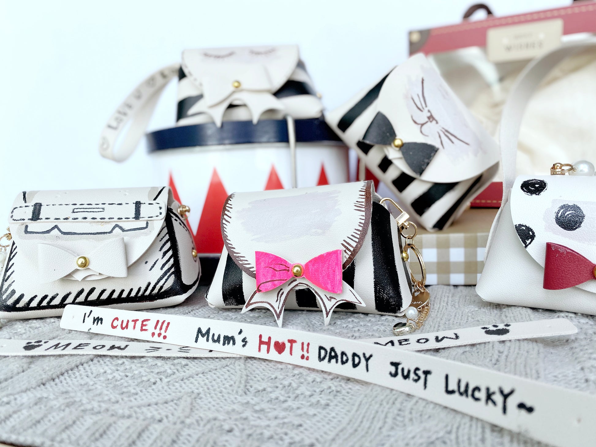 除了時尚的街頭款式和塗鴉字體之外,設計師還悉心預設了顏色鮮明的幾何圖案和可愛動物造型圖案,適合4 歲至14 歲的小朋友參加!大人和小朋友在輕鬆愉快的1.5小時工作坊,一起合制獨一無二的親子裝! 迷你手袋圖案都是皮革尊用的仿水顏料,主要材料是柔軟的PU 仿皮,配上金屬扣可隨時扣在手袋當掛飾用,又可放証件和小巧的化妝品等!